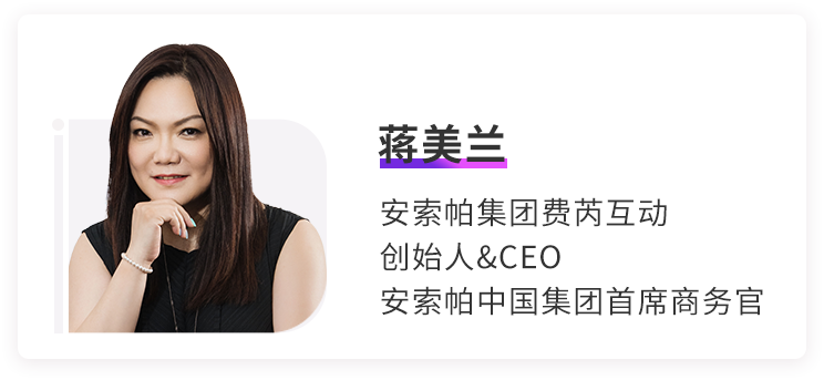 拥有21年研究零售业、广告及新媒体领域经验的安索帕集团费芮互动创始人&CEO@蒋美兰,分别有着10年零售业、10年广告业、6年新媒体的经历。