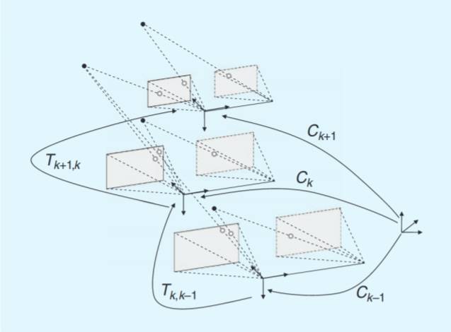 图 30:Scaramuzza & Fraundorfer (2011) 的视觉测距问题图例。Tk,k−1 转换在两个相邻机位(或相机系统位置)由使用视觉特征而获得。所有转换的累积服从相对于初始坐标系 k = 0 的绝对姿态 Ck。源自 Scaramuzza & Fraundorfer (2011).