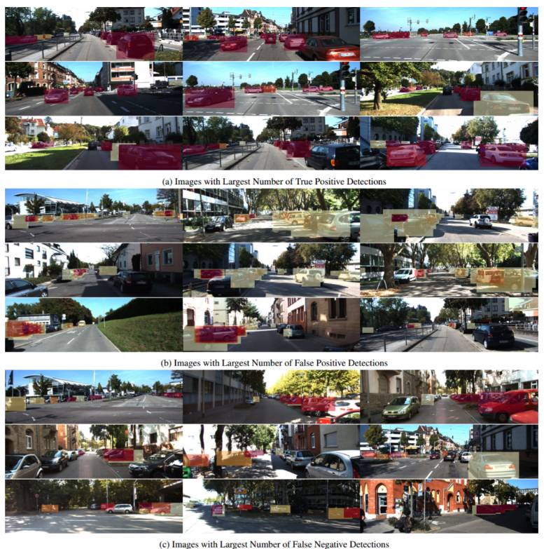 图 9:KITTI 汽车检测分析。每个部分分别展示了包含大量真正例(TP) 检测、假正例(FP)检测和假负例(FN) 检测的图像。如果所有的检测器的 TP、FP 或 FN 一致,目标被标记为红色。如果只有一部分检测器一致,目标标记为黄色。通过 KITTI 评测服务器上公开的 15 种顶级方法,我们已经建立了排名。