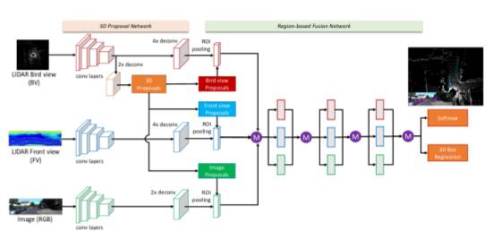 图 8:Chen et al. (2016b) 提出的网络综合了来自鸟类视野的分区(region-wise)特征,LiDAR 点云前视图以及 RGB 作为 deep fusion network 的输入。