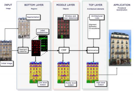 图 16:Mathias et al. (2016) 提出用于外表面解析的三层解决方案。他们首先分割外表面,并将概率分布分配给语义类作为提取视觉特征。下一层他们使用特定目标的检测器,比如门或窗的检测器从底层改进分类器的输出。最后,他们结合弱架构先验,并使用基于采样的方法搜索最优表面标记。