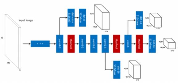 图 7:Cai et al. (2016) 提出的提议子网络(proposal sub-network),在多输出层中进行识别,匹配不同尺度的目标。可以综合特定尺度侦测器,生成一个强大的多尺度目标侦测器。