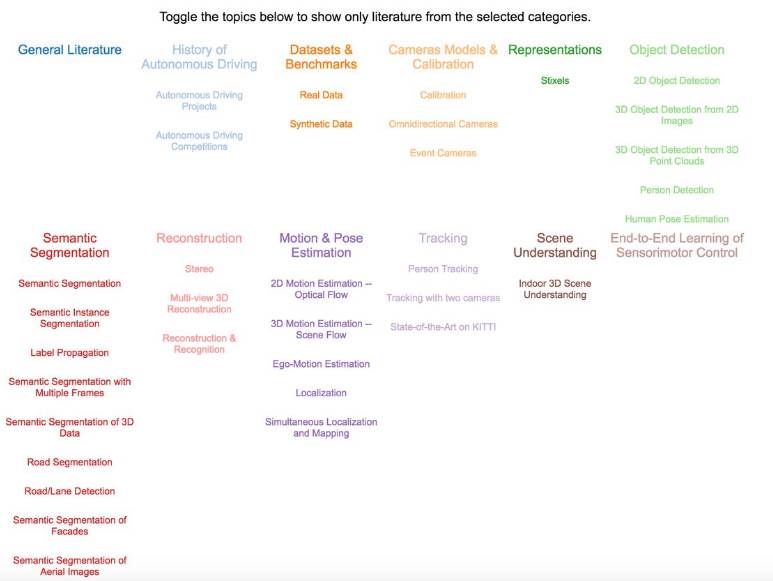 作者们给出的自动驾驶视觉领域中问题的分类。在此交互式工具中,点击这些主题就能搜索相关论文。
