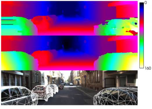 图 19:使用目标知识解决立体匹配模糊问题。立体方法通常在无纹理或半透明表面(顶部,Zbontar & LeCun (2016))无法反射。而使用目标知识,通过加强对模糊表面(中间)不一致性的认同,可以在保持数量上和质量上优良结果的同时,恢复场景目标的 3D 几何形(底部)。源自 Guney & Geiger (2015)。