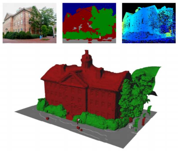 图 22:Haene et al. (2013) 连结 3D 场景重建和分类。上面一行显示输入图像及其 2D 语义分割与深度图的示例。下面显示了连接优化和分类所得出的几何形。源自 Haene et al. (2013)。