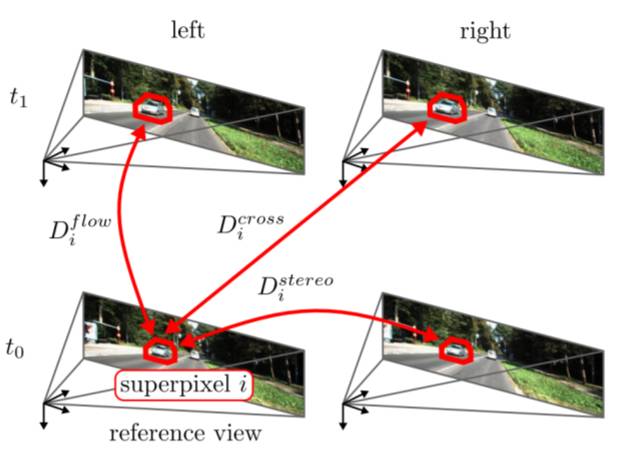 图 27: 场景流。基于图像场景流的最小设置由两个连续的立体图像对给出。源自 Menze & Geiger (2015)。