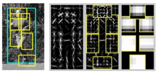 图 6: Deformable Part Model 进行样本侦测,模型是 Felzenszwalb et al. (2008) 提出的。DPM 包括一个和多个高分辨率模型,还有一个用来限制每部分位置的 spatial constellation 模型。