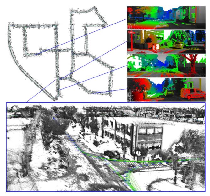 图 31:Engel et al. (2015) 提出的立体 LSD-SLAM 方法能计算精确相机运动和实时半稠密(semi-dense)概率深度图。深度可视化使用蓝色代表远处场景点,红色代表近处目标。源自 Engel et al. (2015)。