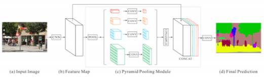 图 13: Zhao et al. (2016) 提出的方法的概览。金字塔解析模块(c)被用于一个 CNN 的特征图(b)上,并被输入一个卷积层用于像素水平的估测(d)。