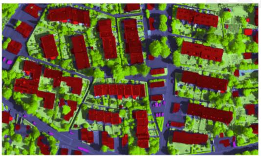 图 17:ISPRS Vaihingen 采用由 Marmanis et al. (2016b) 提出的 FCN 集合进行场景的语义分割。源自 Marmanis et al. (2016b)。