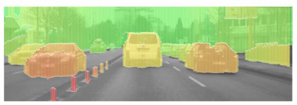 图 5: Pfeiffer & Franke (2011) 的多层 Stixel 世界表征。这一场景被切割为叫做 Stixels 的平面部分。与 Stixel World of Badino et al. (2009) 相反,它可以将目标定位在一单个图像列中的多个深度位置。颜色代表的是与障碍物的距离,红色代表靠近,绿色代表还离得比较远。