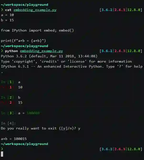 当你运行代码并且解释器到达带有embed()函数的行时,它将打开一个IPython会话。你可以仔细查看代码中发生了什么。当你完成后,你只需要使用Ctrl+d关闭会话,代码将继续执行。这种方法的一个优点是,当你关闭IPython会话时,你在IPython中所做的所有修改都将保存下来。因此,你可以用这种方式对变量或函数进行修改(甚至可以用一些简单的日志来修饰函数),并查看其余代码的行为。