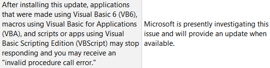 一些应用程序和脚本可能停止响应,并在受影响的系统上显示“无效的过程调用错误”,这包括使用Visual Basic 6(VB6)创建的一些应用程序、使用Visual Basic for Applications(VBA)创建的宏指令,以及使用Visual Basic Scripting Edition(VBScript)创建的脚本或应用程序。