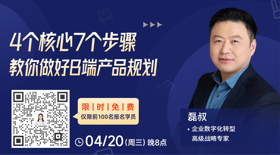 本周三晚8点,企业数字化转型高级战略专家@磊叔直播在线直播,通过4个核心7个步骤教你做好B端产品规划!