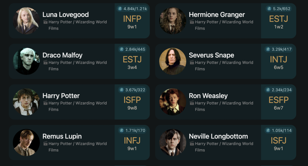 哈利·波特是具有冒险精神的ISFP,赫敏是激进澎湃的管理者ESTJ,罗恩是典型的娱乐型人格ESFP,露娜是带一点神经质的INFP。