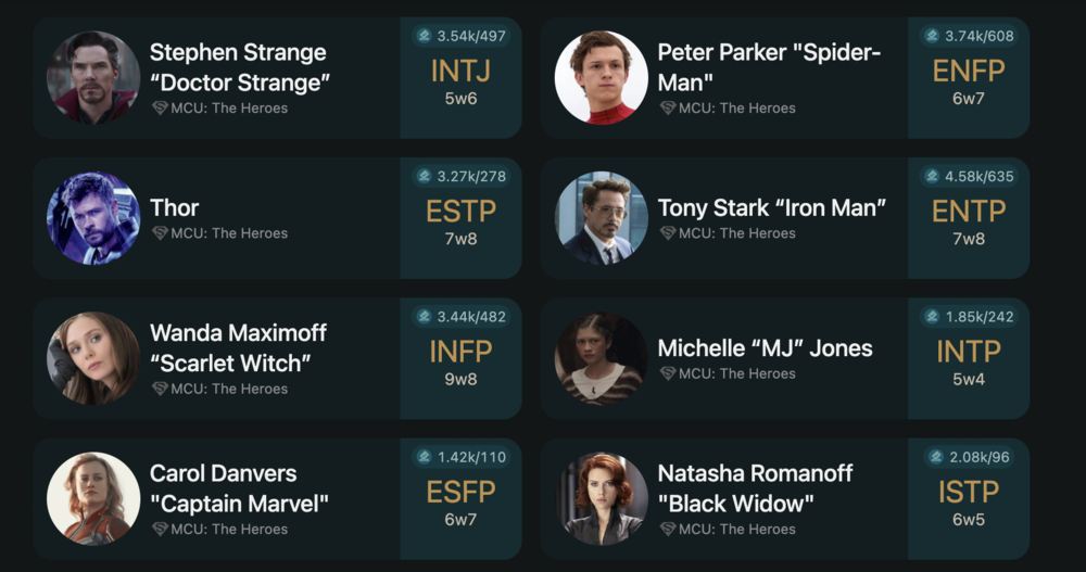 钢铁侠是外向型的企业家人格ESTP,蜘蛛侠是可爱小狗ENFP,奇异博士自然是智商拔群的INTJ。