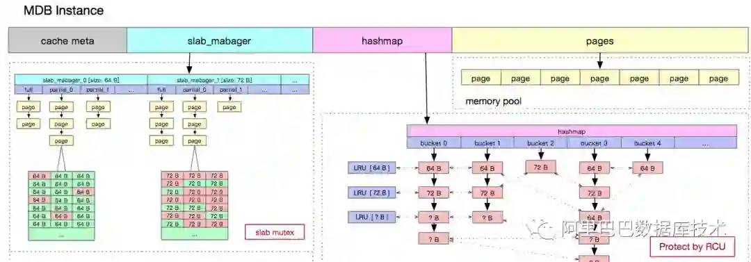 所以在控制合理数据切片数量的情况下,增加每个切片的并发访问能力,就成了提升MDB性能的一个途径。提高一个临界资源(切片)的终极办法就是把它优化为无锁的。这里我们采用RCU(Read-Copy Update),后台异步GC和ThreadLocal的方案实现切片的并发访问,切片的并发访问能力同时也解决了热点key访问的问题。