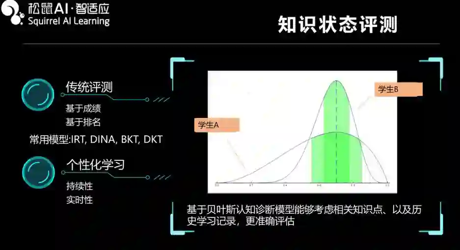 在学习过程里面,传统的测评是基于成绩或排名,传统的智适应测评是基于 IRT、DINA、BKT、DKT 模型,而这些模型的一个缺陷就是无法进行实时评测,我们的系统基于贝叶斯理论是能够基于学生过去所有的记录来进行持续性的,实时的评估。