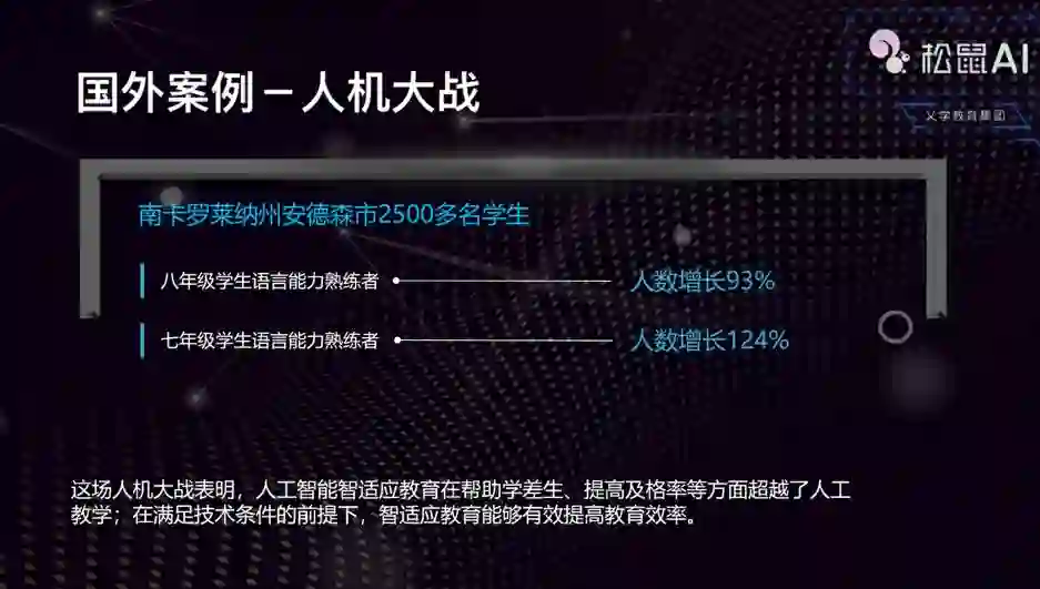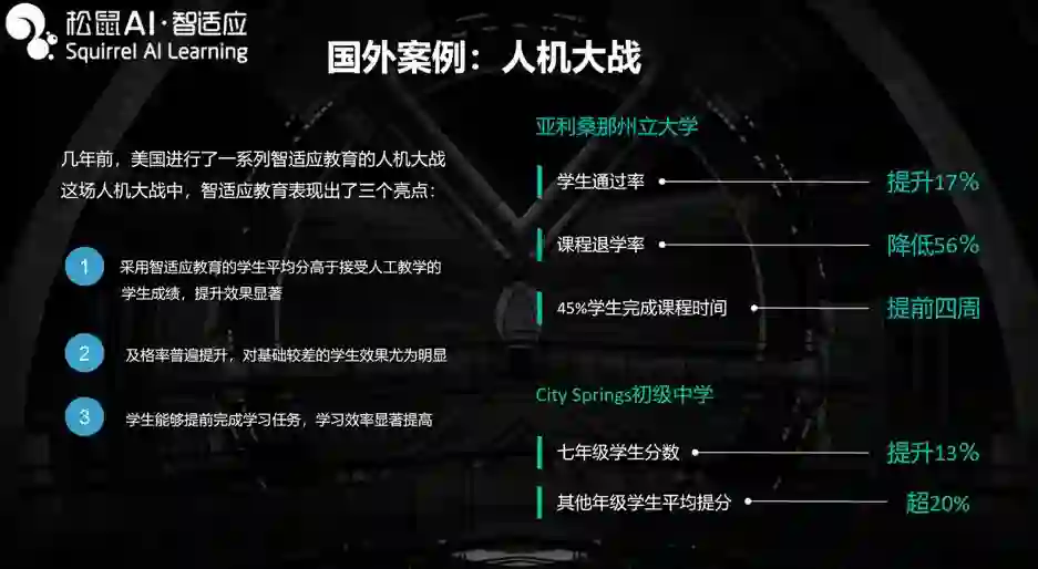 松鼠 AI 公司司机女儿,曾经考试成绩不佳,通过使用松鼠 AI 智适应系统,考上上海最好的波音公司技术学校,后又继续使用系统考到全班前三,被选为优秀学生送到美国西雅图波音总部继续深造,并且可以选择终身在波音公司工作。