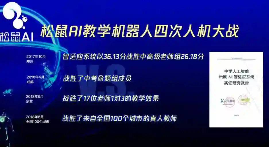 我们举办了一系列的人机大战,我们在美国斯坦福国际研究院的帮助下设计了方案,因为他们过去有过跟美国政府,跟美国公立的学校做了很多类似的实验,我们把学生分为两批,一个是传统教育的学生,一批是用我们系统的,他能够登录我们的系统,没有真人老师的干预,我们根据他们在学校里面的成绩,保证他们的能力水平是一致的。并且我们会通过前测和后测卷体现成绩提升的差异性。为了减少干扰因素,我们的时间也限定在四到五天之内。我们先后举办了四次实验,有效证明了我们的系统能够和真老师的教学水平不相上下。