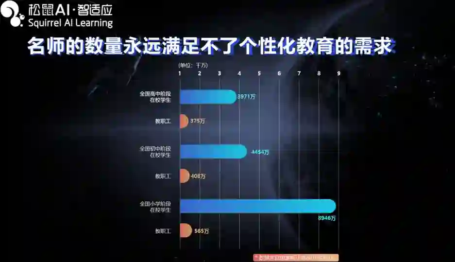 所有孩子都是接受千人一面的教育,学习的内容,路径,都是一样的,因为老师是按照传统的方式给所有的学生进行统一授课。最主要的原因是我们传统的学校里面老师跟学生的数量往往是不匹配的。根据国家统计局的统计,老师跟学生的数量存在巨大差距。