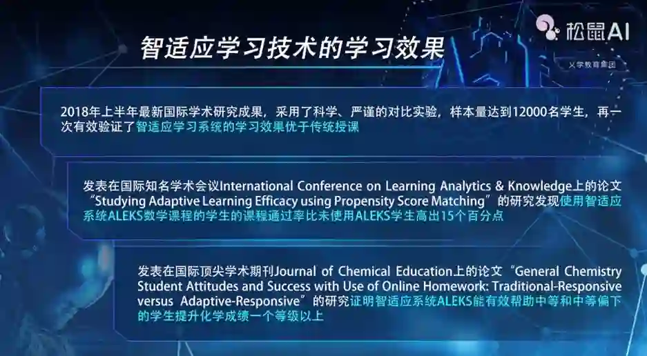 去年有三篇相关的学术论文,科学家和研究者们用科学权威的方法验证了智适应学习产品的有效性。2018 年上半年发表的一篇论文有效证明:使用人工智能产品 ALEKS 的学生课程通过率比未使用的要高 15 个百分点,也有论文研究证明人工智能是可以帮助学生提升成绩的。