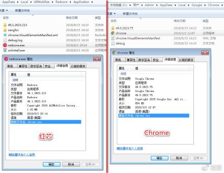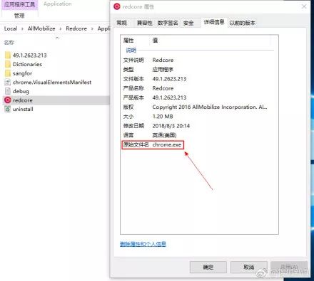 红芯浏览器的 redcore.exe 的「属性」中,原始文件名显示【chrome.exe】!
