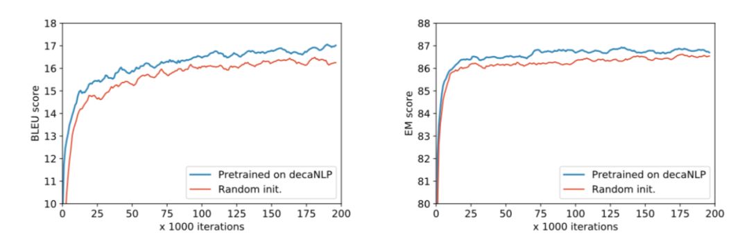 图5.在适应新域和学习新任务时,MQAN对decaNLP的预训练优于随机初始化。左:一个新的语言对的训练-英文到捷克语,右:训练一个新的任务-实体识别命名(NER)