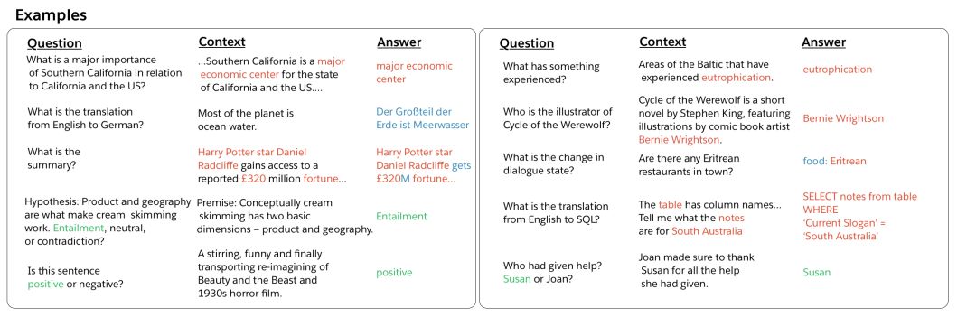 图2.(问题、上下文、答案)问答、机器翻译、摘要、自然语言推理、情感分析、词性标注、关系抽取、目标导向对话、语义解析和代词解析任务的例子