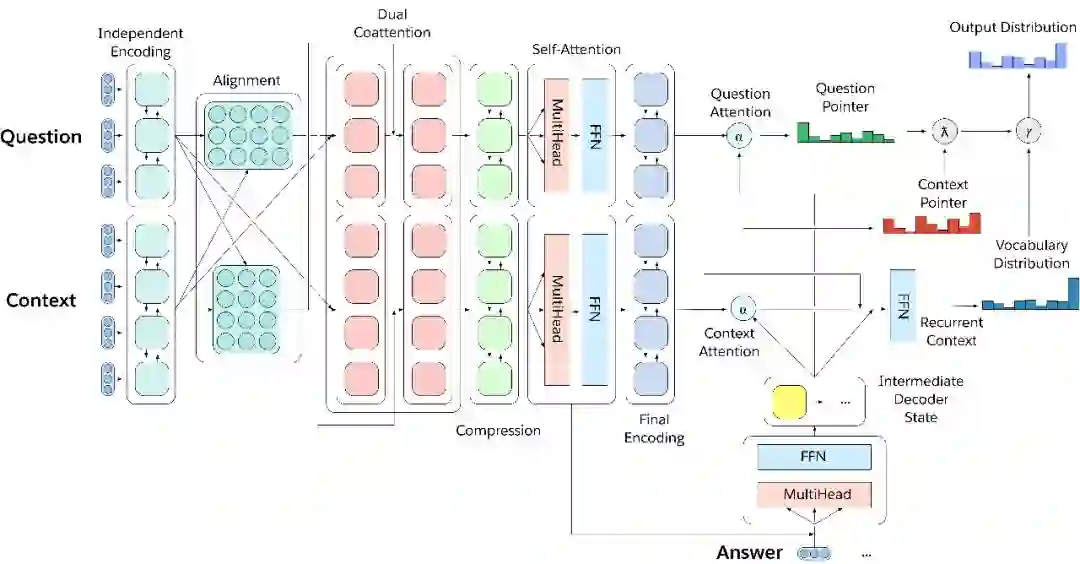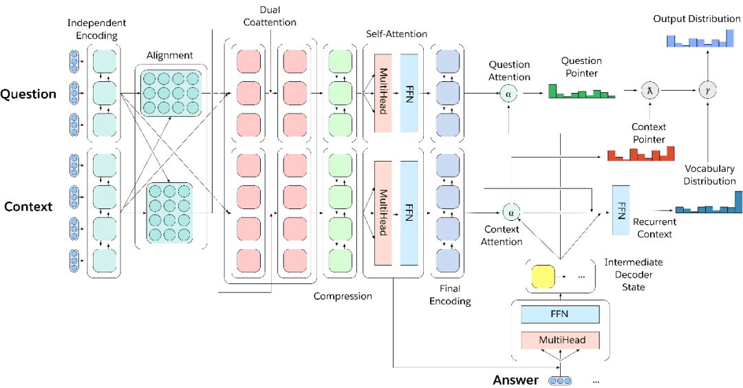 简单地说,MQAN采用一个问题和一个上下文背景文档,用BiLSTM编码,使用额外的共同关注对两个序列的条件进行表示,用另两个BiLSTM压缩所有这些信息,使其能够更高层进行计算,用自我关注的方式来收集这种长距离依赖关系,然后使用两个BiLSTM对问题和背景环境的进行最终的表示。多指针生成器解码器着重于问题、上下文以及先前输出象征来决定是否从问题中复制,还是从上下文复制,或者从有限的词汇表中生成。关于我们的模型的其他细节可以在我们的文章的第3节中找到。