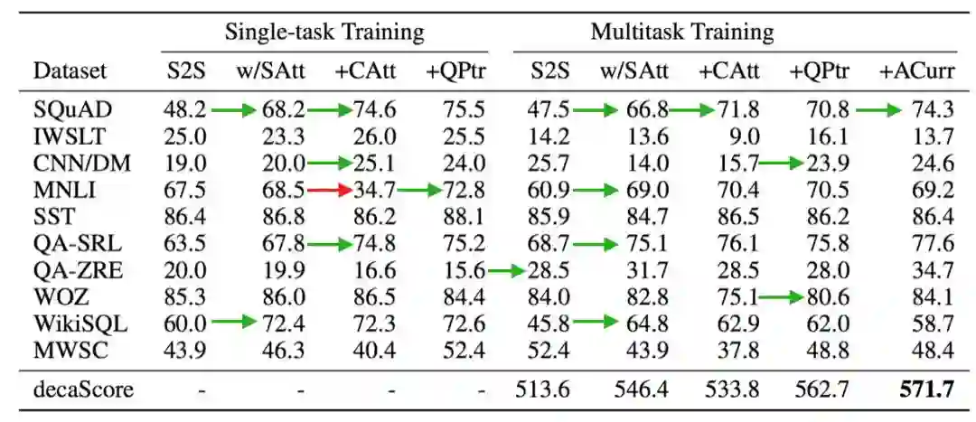除了MQAN,我们还尝试了几种基线方法并计算了它们的十项全能得分。第一个基线,S2S,是具有注意力和指针生成器的序列到序列的网络。我们的第二基线,S2S w/SAtt,是一个S2S网络,它在编码器侧的BiLTM层和解码器侧的LSTM层之间添加了自注意(Transformer)层。我们的第三个基线,+CAtt,将上下文和问题分成两个序列,并在编码器侧添加一个额外的共同关注层。MQAN是一个种带有附加问题指针的+CAtt模型,在我们的基线/消融研究中,它被称为+QPtr。针对每一个模型,我们都提出了两种实验。第一,我们报告出十个任务模型中的单任务性能。第二,我们提出多任务性能,即模型在所有任务中被联合训练所体现出的性能。