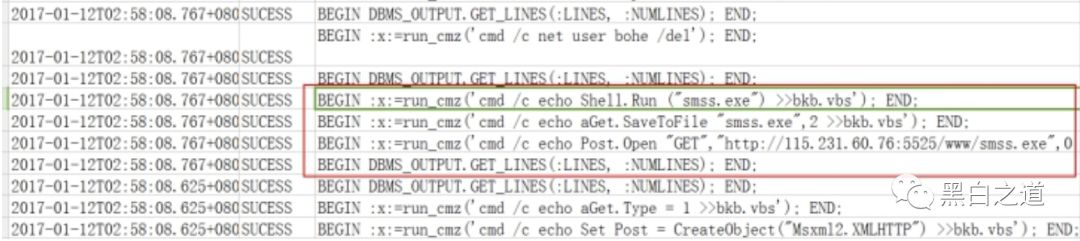 在tns日志中,oracle相关存储得到入侵者相关的存储利用。如downfile‐smss.exe,地址为115.231.60.76