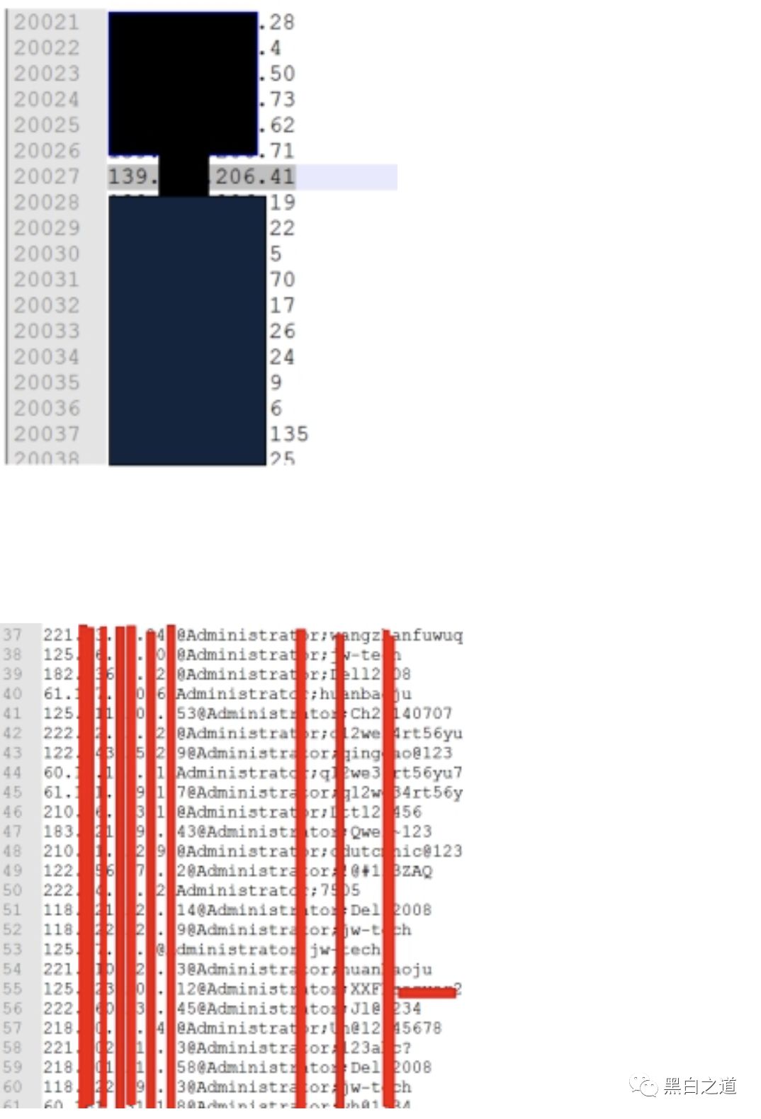 再该服务器上留有大量以地名名为的txt文本(如beijing.txt)。文本内容为IP,部分内容为账号,密码,ip。其中dongbei.txt(被攻击者归属地为东北)找到某政府对应IP。