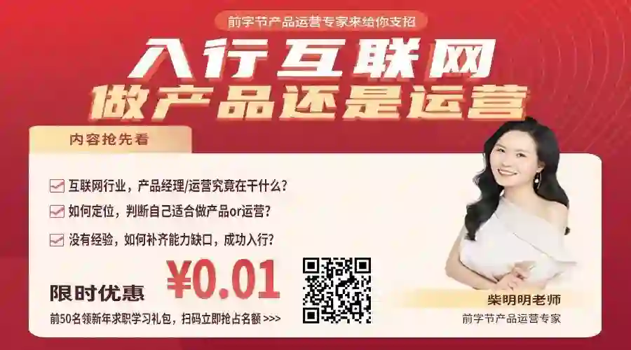 为了帮助更多纠结中的同学,了解“产品”和“运营”该如何选择?1月8日星期六14:30-15:30,【前字节产品运营专家@柴明明老师】,1小时直播分享她眼中的“产品”和“运营”,帮助你更好的认识两者的联系与区别,判断自己到底是适合产品还是运营~