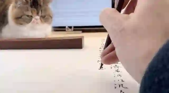 这些看起来像是老干部的爱好,给他搭了一个安全感的壳子,不拍戏的时候,他自己能玩得挺好。祖峰手机里有个App,「古诗文网」,只要第二天没事,晚上睡前就找好一篇文章,早晨醒了,一抄两个多小时。猫就在旁边呼噜呼噜地看着他写,高兴了,就往它鼻子上点点墨水,看着猫暴走。
