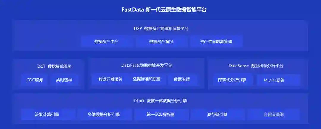 而滴普科技推出的 FastData,希望帮助用户搭建企业级流批一体、湖仓一体的数据智能平台。为了实现“全栈式”的数据平台级服务,滴普科技核心研发了流批一体数据分析处理引擎 DLink、数据集成服务DCT、数据智能开发平台 DataFacts,用于企业数据科学分析、可视化建模、机器学习等的数据科学分析平台 DataSense,以及数据资产管理和运营平台 DXP。在五大核心技术能力之下,滴普科技采用存算分离架构,实现数据的全链路监测分析。最上层,则可以与 BI、AI 应用厂商对接,真正实现湖仓一体的数据智能应用。