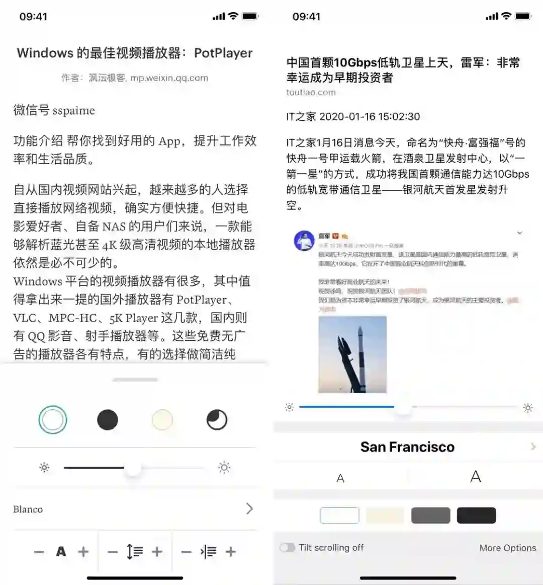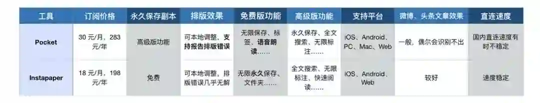 两者在免费版的体验上表现都很出色,支持保存无限数量的文章、多平台同步等功能。Instapaper 免费支持永久保存副本这一点显然比 Pocket 更能吸引用户,而 Pocket 的语音朗读功能则吸引了不少喜欢「听文章」的人。在高级版方面,两者都支持全文搜索、无限标注等功能。