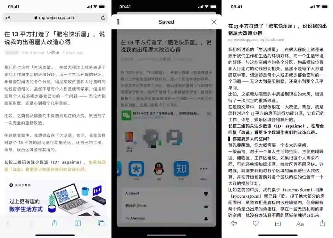 虽然保存为 PDF 既便捷、效果也不错,但 PDF 有一定的弊端:比如图片形式的 PDF 无法复制和检索文字、无法根据屏幕大小自适应调整等。网页存档则能在保持便捷和良好阅读效果的前提下,改善这些问题,毕竟网页存档是直接将整个网页保存下来的。