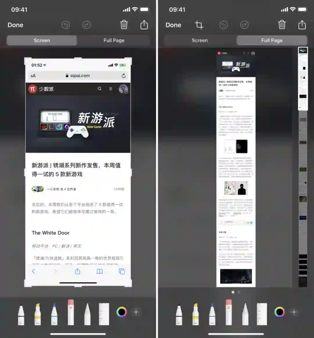 以 iOS 13 上的 Safari 为例,你有两种方法将网页保存成 PDF。最简单的方式就是在网站上截图,随后选择「整页」并调整范围即可。即使不选择「整页」,系统也会在你截图后自动生成一个 PDF 文档保存在 iCloud Drive 的「下载项」里。