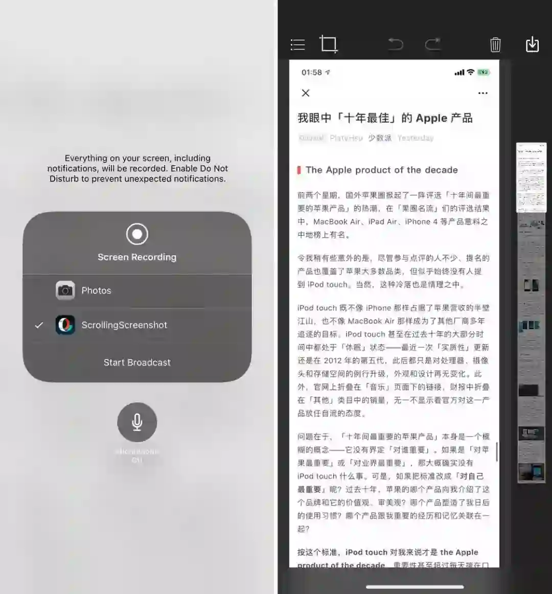 虽然在 iOS 上将网页保存为 PDF 的操作并不复杂,但偶尔会出现网页无法完全加载的情况。在一些长篇幅文章,或是配图较多的文章中尤为明显。这时候你也可以利用 滚动截屏 App 来实现网页的存档,生成为长截图后再利用快捷指令将它导出成 PDF。