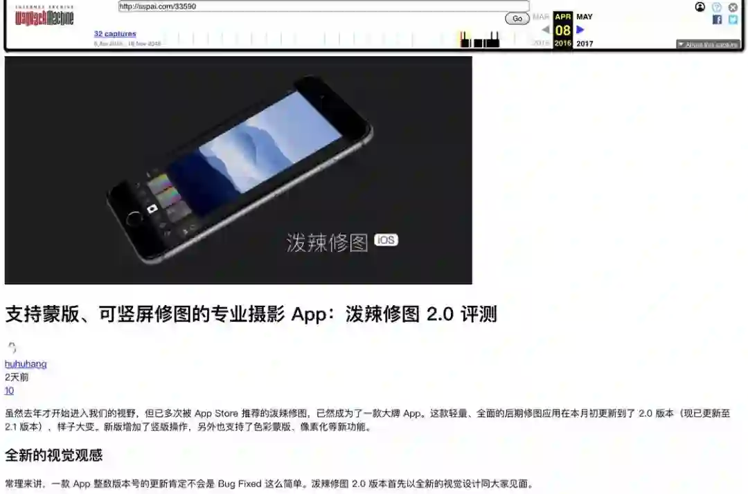 这种方法虽然可以帮你抓取已经被删除的文章,但局限还是比较大的。首先你必须知道文章的具体链接。其次,你所访问的站点必须具有一定的名气才能被 Internet Archive 截取更多快照,比如一些个人博客的文章就不适合通过此方法来找回。这种方法更适合用来保存浏览器书签中失效的网页,公众号文章基本不适用于这种方法。