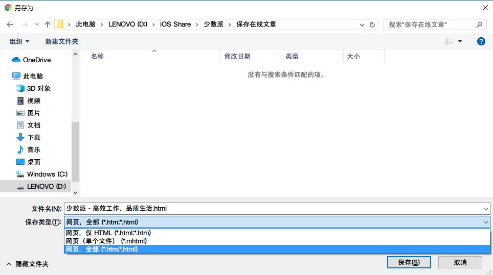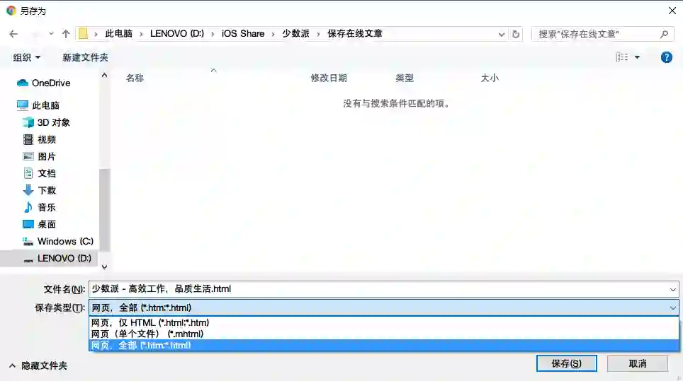 需要注意的是,Windows 默认情况下会将网页保存为 .html 格式,并生成一个包含媒体素材的文件夹。你需要手动将格式修改为「网页(单个文件)」,才能生成单个 .mthml 文件。