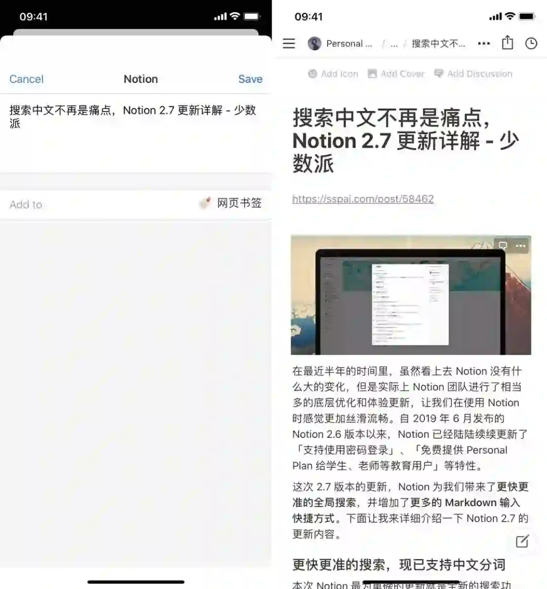 在移动平台,你可以直接通过分享菜单将网页保存到 Notion。不过这种方法偶尔会出现一些问题,比如只保存了链接而没保存内容,或是内容保存不全。虽然 Notion 剪藏在移动端的体验还有待改善,但如果你是一个 Notion 用户,不妨将网页剪藏也加入你的 Notion 资料库中。
