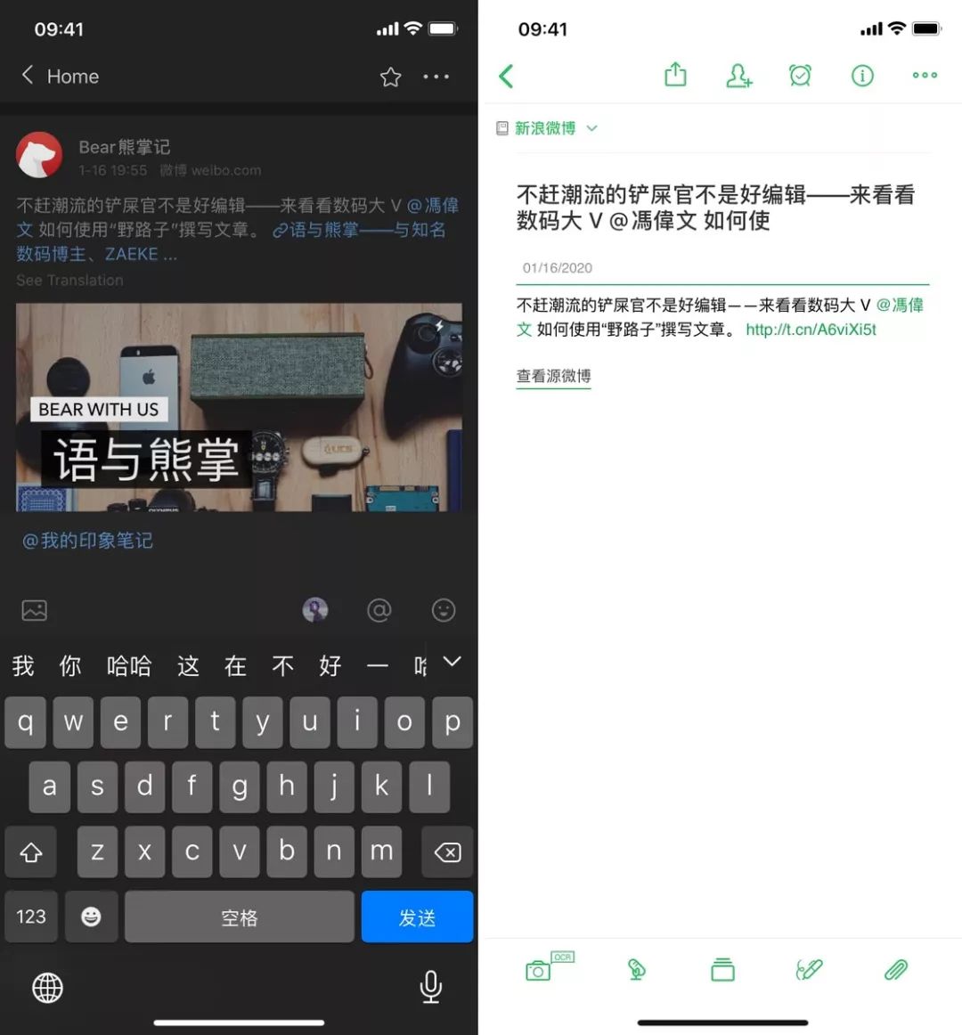 至于微博和今日头条等平台的文章,两者都是以「保存网页」的形式来转存的,因此差别不大。虽然印象笔记支持通过 @我的印象笔记 来快速保存微博,但仅限于微博,而不包括微博文章。