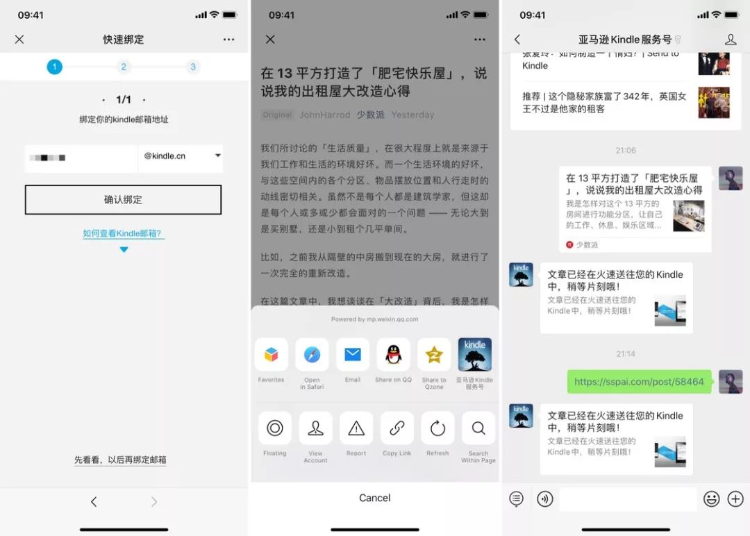将文章发送至 Kindle 其实并不难,你首先需要在微信中关注「亚马逊 Kindle 服务号」并绑定你的 Kindle 邮箱。当你看到想要推送的公众号文章时,点击右上角的菜单按钮,并选择「亚马逊 Kindle 服务号」即可。除此之外,服务号还支持发送文字、图片到 Kindle。
