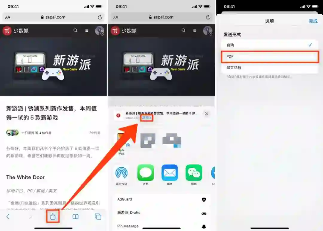 第二种方法则是通过「万能」的分享菜单实现。在 Safari 中点击分享按钮,在弹出的菜单中选择「选项」,就可以选择 PDF 并将其直接分享转存至其它应用。