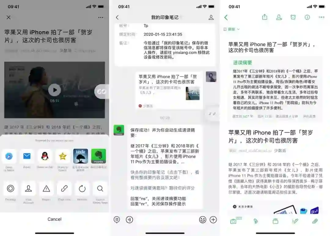 在微信公众号、微博等我们常用的国内平台上,OneNote 就显得力不从心。如果你想保存微信公众号的文章,只需要关注「我的印象笔记」服务号并绑定账号就能实现快速保存。通过服务号保存的文章会生成速读摘要,还能帮你计算文章字数、图片数和阅读时间。