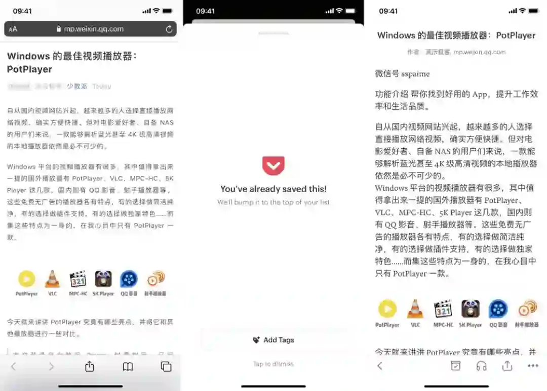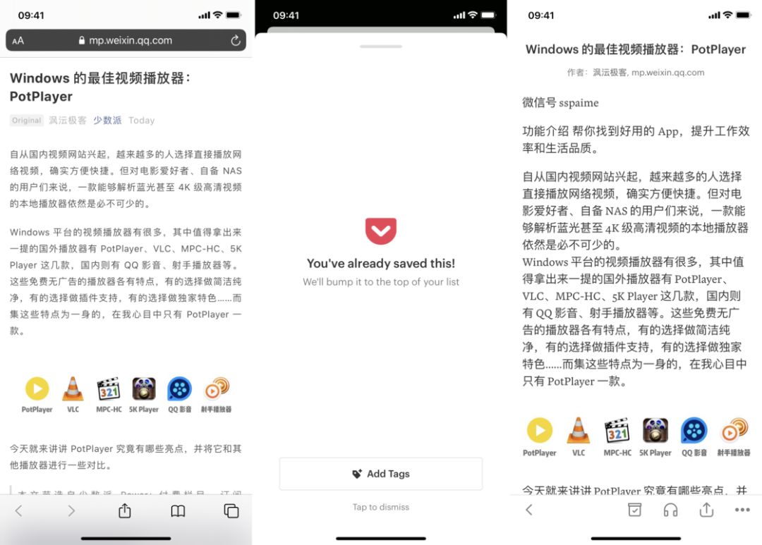 Pocket 则略有不同,你所保存到 Pocket 的文章会在你打开 Pocket 后加载并保存至本地。也就是说,如果你在设备 A 上将一篇文章保存至 Pocket 并下载到本地后,文章就被删除了,那么你将无法在设备 B 上重新下载回来。