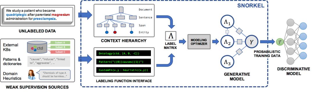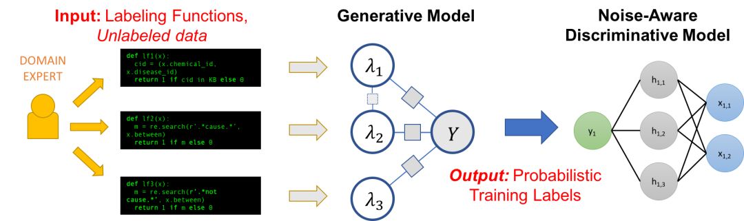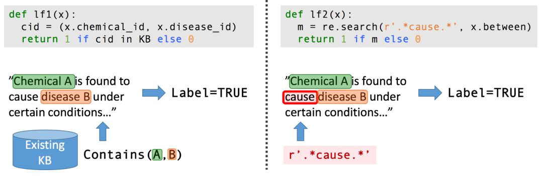 考虑这样一个任务:从科学文献中提取某种化学 - 疾病的关系。我们可能没有足够大的标记训练数据集来完成这项任务。然而,在生物医学领域,存在着丰富的知识本体、词典等资源,其中包括各种化学与疾病名称数据、各种类型的已知化学 - 疾病关系数据库等,我们可以利用这些资源来为我们的任务提供弱监督。此外,我们还可以与生物学领域的合作者一起提出一系列特定于任务的启发式、正则表达式模式、经验法则和负标签生成策略。