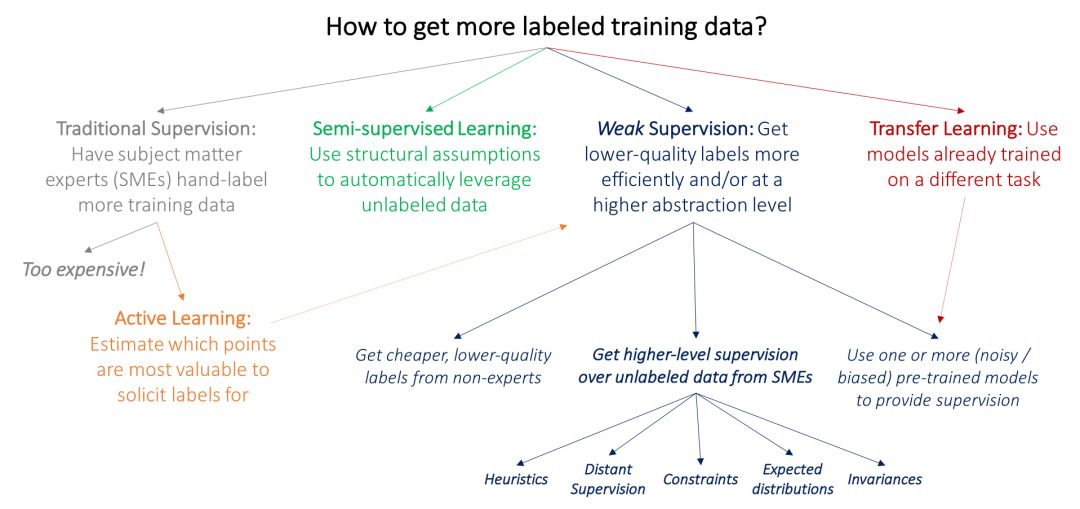 ML 中的许多传统研究方法也同样受到对标记训练数据的需求的推动。我们首先将这些方法与弱监督方法 (weak supervision) 区分开来:弱监督是利用来自主题领域专家(subject matter experts,简称 SME) 的更高级别和 / 或更嘈杂的输入。